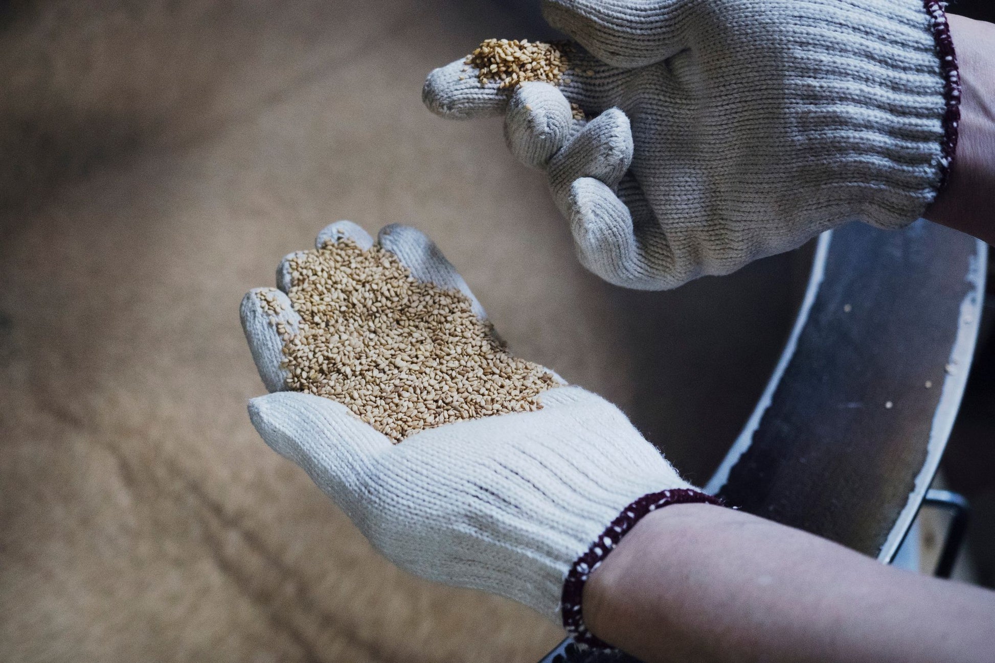 These days, people don’t like bitter sesame oil because they often pour raw sesame oil on foods like vegetable directly. We did a lot of trial and error in attempt to make sesame oil that’s not bitter but still has incredible aroma. Then we found that using black sesames that are produced in a particular producing district can make less bitter sesame oil even if it’s roasted for a long time. This is how we came up with our current black sesame oil that has incredible aroma that my grandfather’s sesame oil had at that time. So this black sesame oil is the very sesame oil that we’ve been producing ever since our company was established.